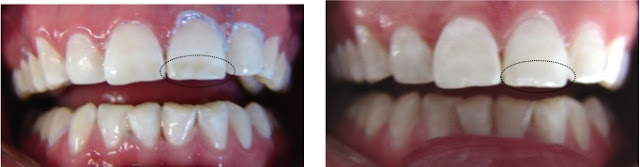 el defecto en el incisivo central superior izquierdo se restauró cosméticamente con una resina igual al resto del color nuevo del diente.. |